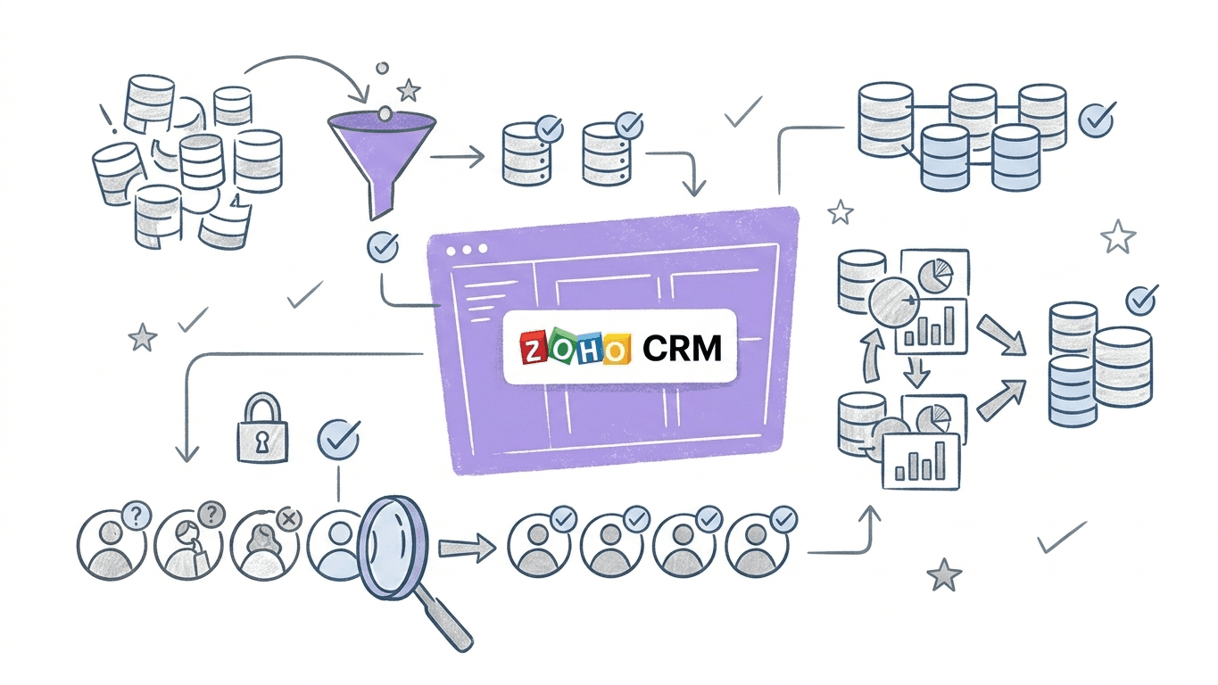 Control de duplicados y deduplicación. Zoho CRM permite marcar campos como únicos -email, teléfono- de modo que el sistema alerta si se intenta crear un registro que ya existe. Para las bases de datos con duplicados ya acumulados, la herramienta de deduplicación detecta coincidencias, fusiona automáticamente los registros idénticos y solicita intervención manual en los casos con conflicto de valores. Documentación oficial: De-duplicate Records en Zoho CRM